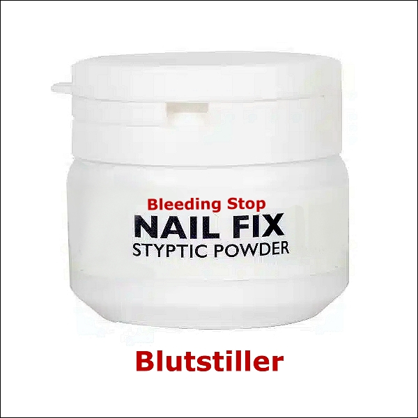 Eine kleine Menge auf die blutende Stelle auftragen um kleinere Wunden und Blutungen sofort zu stoppen – eine stark blutende Kralle eventuell kurze Zeit in das Pulver halten oder das Pulver auftragen.